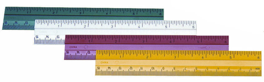 Plastic rulers include both U.S. customary and metric scales. Rulers measure 6″/15cm. Set of 36.