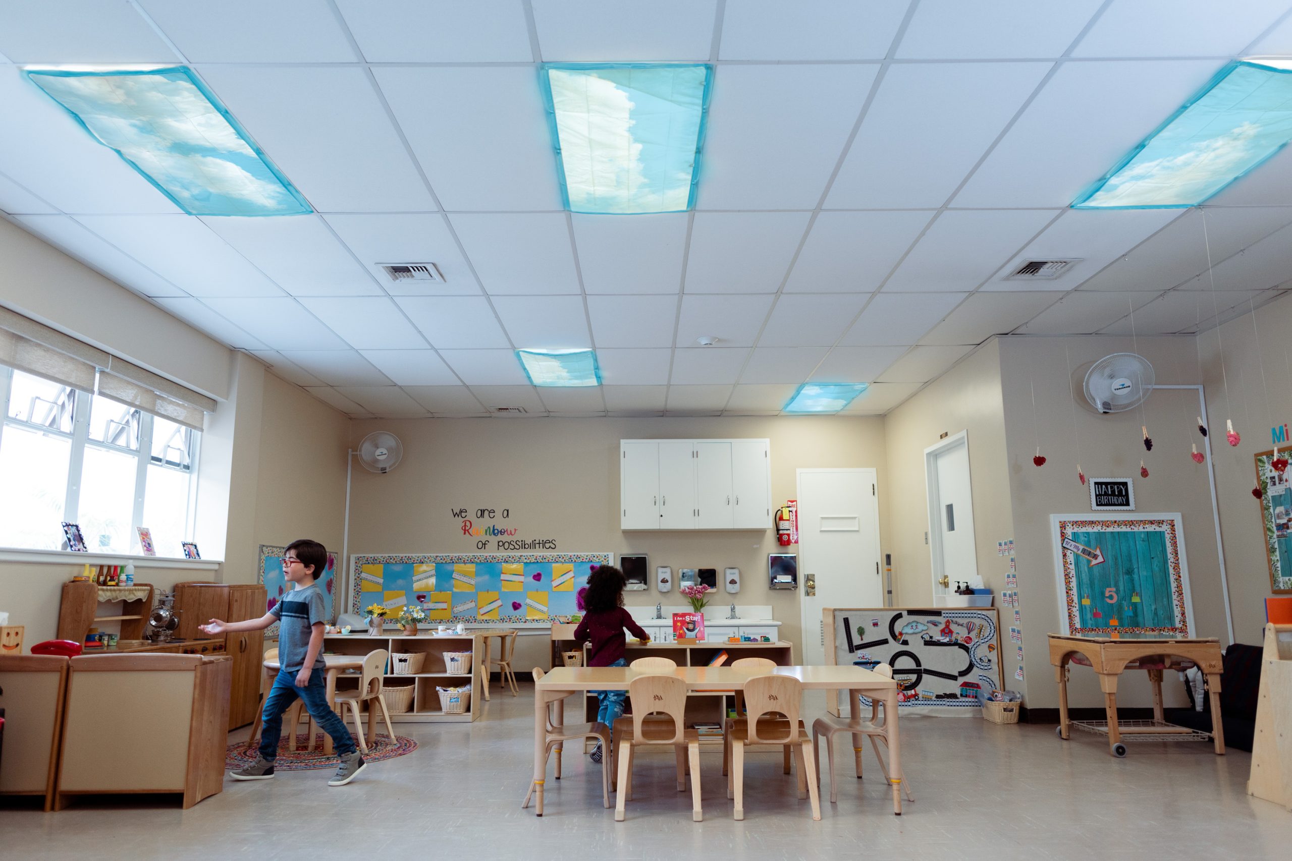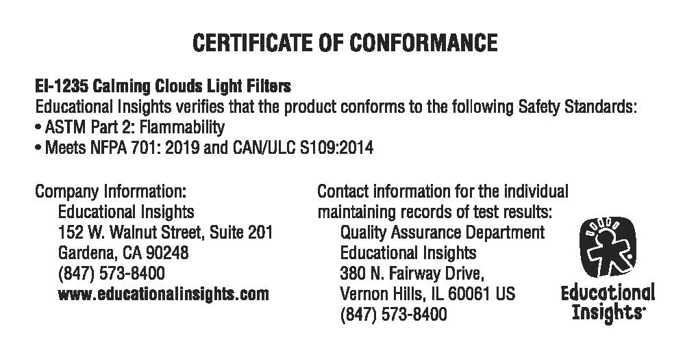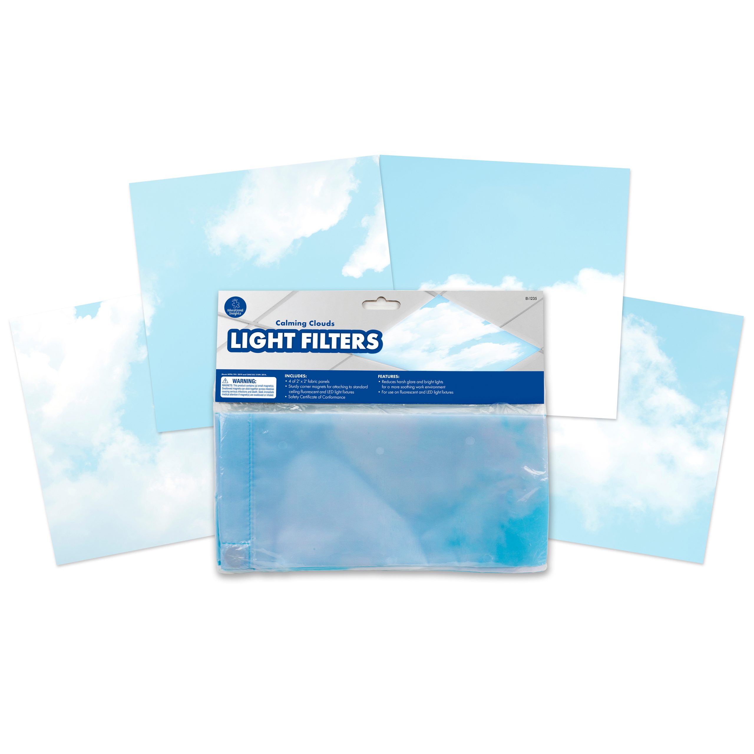 Calming Clouds Light Filters attach easily over standard ceiling fixtures with six sturdy, sewn-in magnets. Each set includes four 2′ x 4′ heat-resistant panels with four different cloud patterns. For use with fluorescent and LED lights only.
