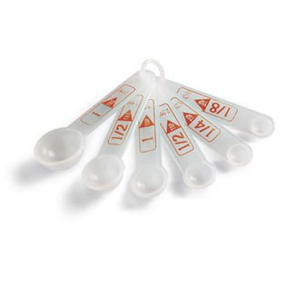 Includes 1/8 teaspoon (0.62 ml), ¼ teaspoon (1.25 ml), ½ teaspoon (2.5 ml), 1 teaspoon (5 ml), ½ tablespoon (7.5 ml), and 1 tablespoon (15 ml) .
